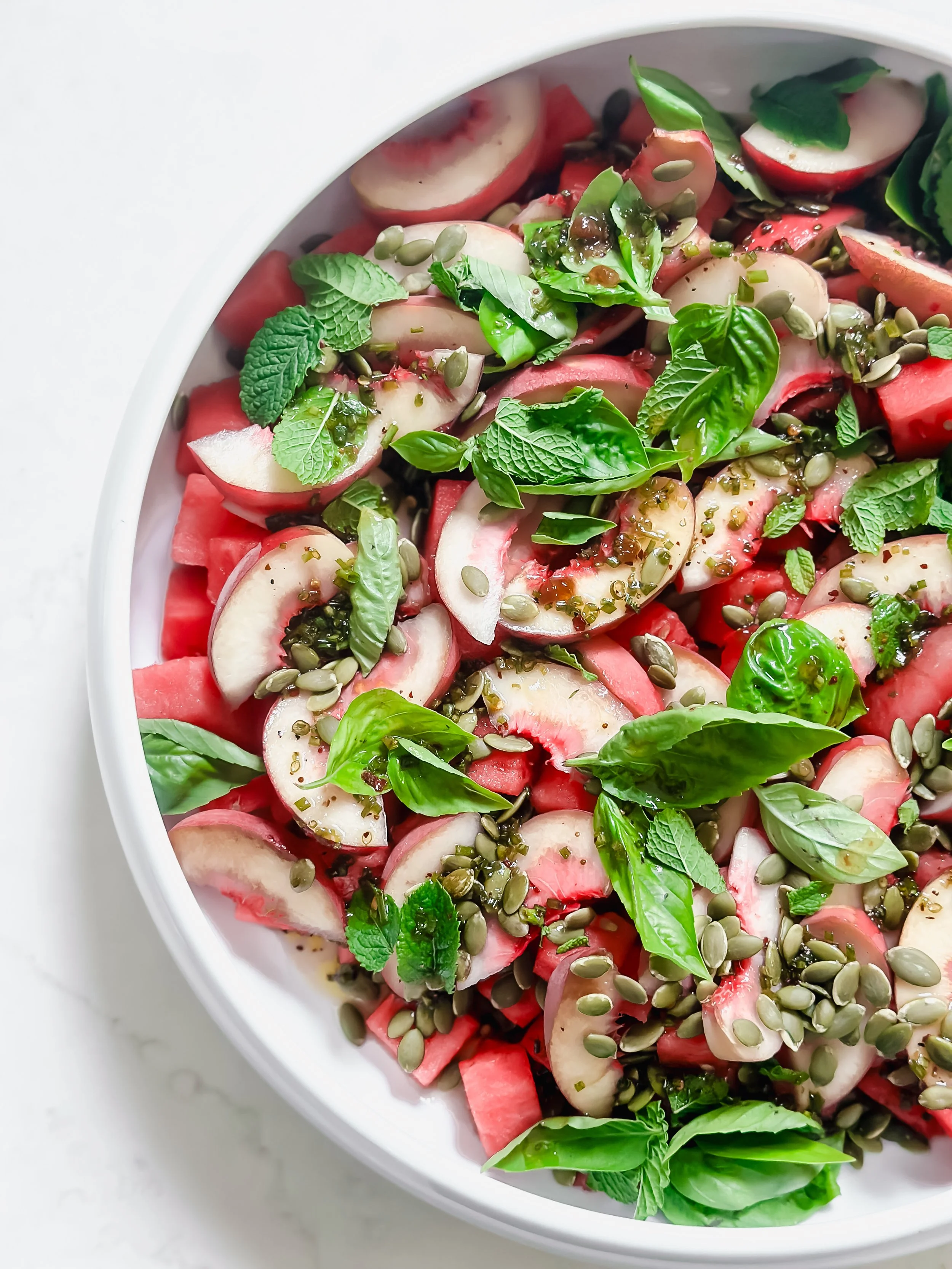 At the heart of this dish are hydrating watermelon and antioxidant-rich peaches—two summer staples loaded with vitamin C, beta-carotene, and electrolytes to keep you cool and replenished. Creamy feta adds calcium and protein, while a handful of toasted pistachios or sprouted pumpkin seeds offers a powerful dose of zinc, magnesium, and heart-healthy fats. (Sprouting seeds also makes them easier to digest and increases nutrient absorption.)